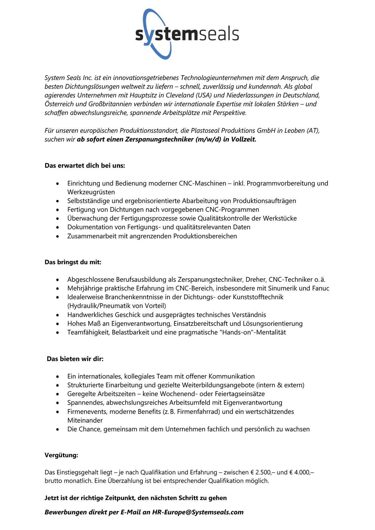Für unseren europäischen Produktionsstandort, die Plastoseal Produktions GmbH in Leoben (AT), suchen wir ab sofort einen Zerspanungstechniker (m/w/d) in Vollzeit.